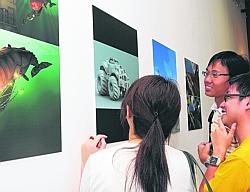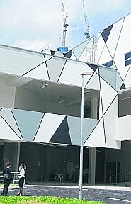 Learning centre: (Left) The Pixel building boasts a funky grey, black and white harlequin-patterned exterior; NTU@one-north houses the Centre for Continuing Education, the Confucius Institute and an alumni clubhouse; aspiring future game developers admiring works of art by DigiPen students