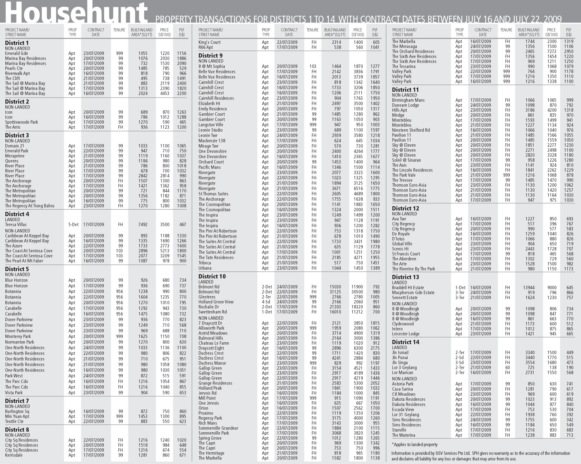 Property transactions for district 1 – 14 with contract dates between Jul 16 and Jul 22, 2009