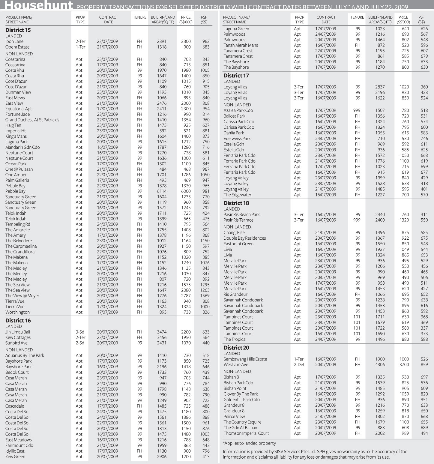Property transactions for selected districts with contract dates between Jul 16 and Jul 22, 2009