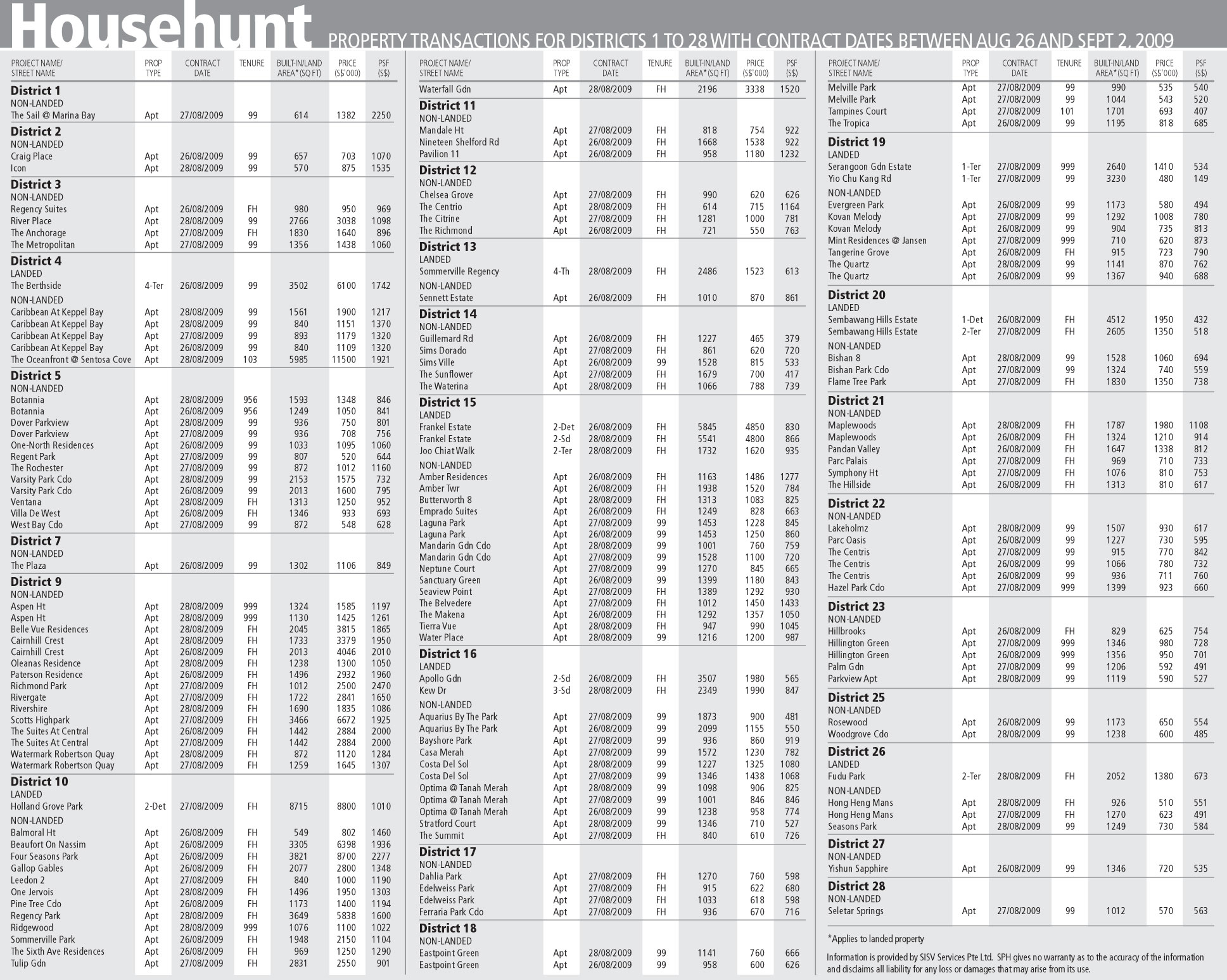 Property transactions for district 1 – 28 with contract dates between Aug 26 and Sep 2, 2009