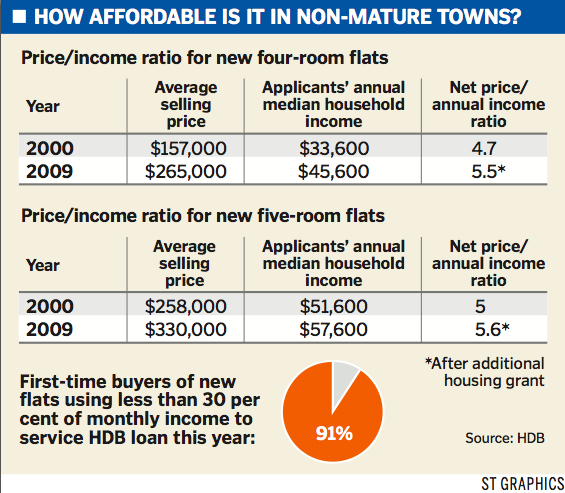 When the HDB compared the average selling price of its new flats in non-mature estates to the median income of first-time applicant households, the ratio for four-room flats increased from 4.7 in 2000 to 5.5 this year. This meant it had become less affordable for applicants over time. The trend was the same for five-room flats which showed the ratio growing from 5 to 5.6.