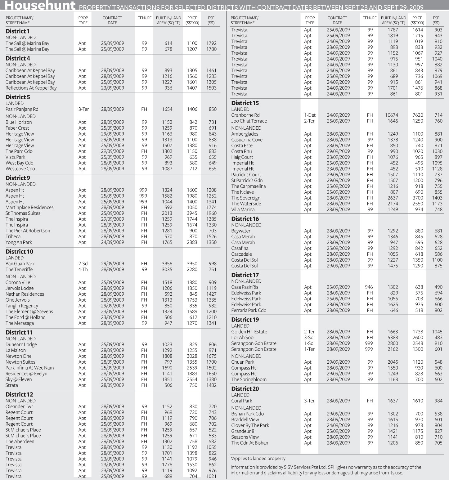 Property transactions for selected districts with contract dates between Sep 23 and Sep 29, 2009