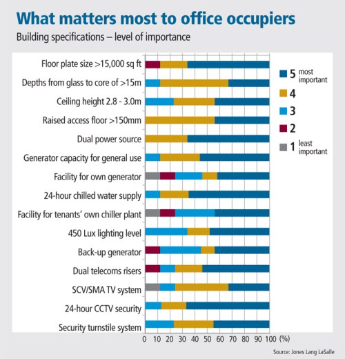 More than 60 per cent of occupiers in JLL’s recent survey viewed floor plates of over 15,000 sq ft at the top of the scale in terms of importance when considering future space. Other key considerations included 24-hour chilled water supply (for air conditioning), dual power source and generator capacity for general use, and security issues.