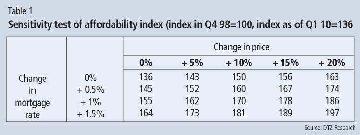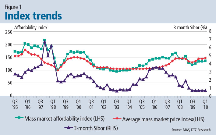 Based on the affordability index, mass market units at end-2009 were more affordable compared to the period between Q1 2006 and Q3 2008. However, as interest rates are at an all-time low, it is a matter of time before they head north. A one-percentage-point increase in interest rates will result in a 14 per cent rise in the affordability index with no change in price. If prices were to increase by five percentage points at the same time, the index would rise by 19 per cent to 162 (Table 1).