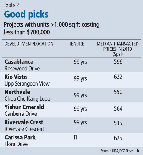At the moment, despite more new projects being launched at prices above $800 per sq ft, there are still a number of projects in the resale market available for less than $700,000 for unit sizes of above 1,000 sq ft. This shows that affordable units still exist and that purchasers are not restricted to micro-sized and high-priced residential units (Table 2).