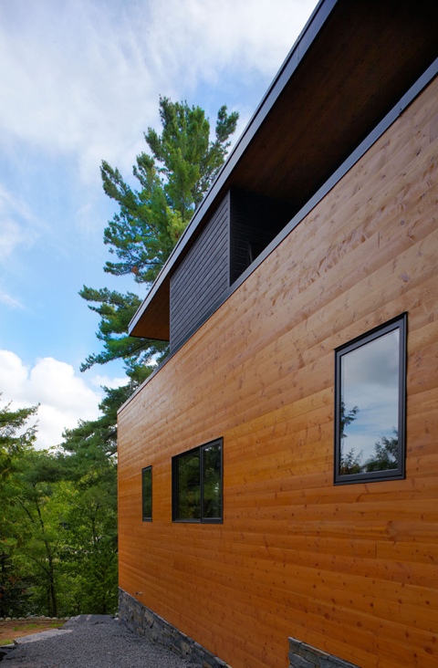 Rising two stories in the air, the Mary Lake Residence in the Village of Port Sydney, Huntsville, Ontario welcomes owners with a body made out of two separate volumes connected by a glazed entrance on the first floor and almost transparent second floor staircase and corridor uniting the upstairs spaces. Surrounded by tall white pines, this creation of Toronto-based studio Altius Architecture was described by them as follows: “The roof of the living room is sheltered between the two solids and becomes an additional outdoor space with a view over the lake, a garden and a hot tub.