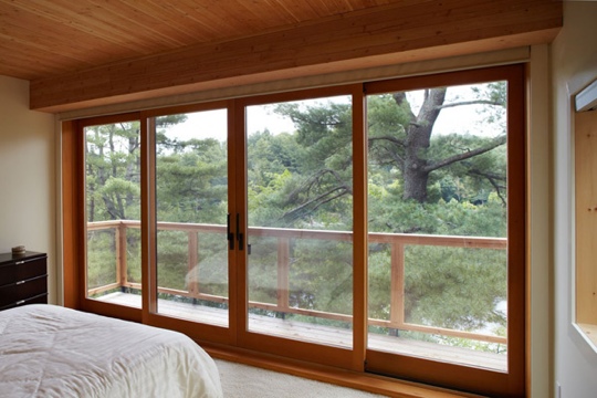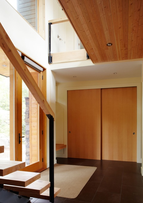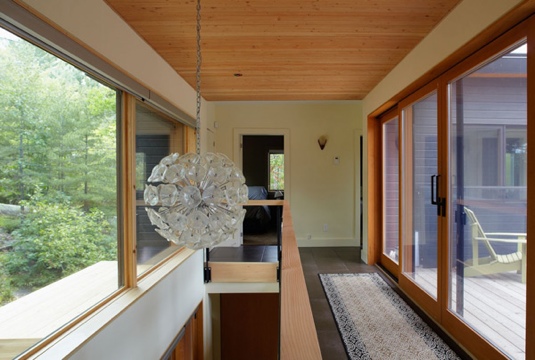The home is a balance of program spaces, with the public entertaining spaces of the living room, dining room and kitchen wrapping one side of the central void and the more private and intimate spaces of the library and den situated at the other. Two stone walls shield the house from the road while a canopy reaches out to create a welcoming entry. Warm yet contemporary materials throughout create a cozy yet light atmosphere.” This 3,000 square foot home boasts a set of sustainable features like passive solar heating, radiant heating, low energy lighting and appliances, and natural ventilation and lighting coming from sliding doors and cleverly placed windows. Green roofs extend nature’s expansion around and on the residence, while the indoor/outdoor connection draws it inside, creating a strong bond between natural and man-made.