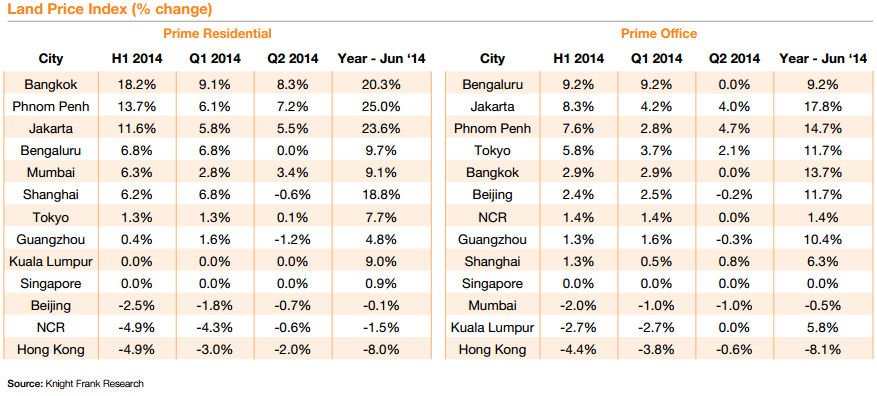 Bangkok saw the largest increase in the prime residential development land index in the first half of 2014. Meanwhile, Bengaluru, known as the Silicon Valley of India, topped Asia for the prime office development land index.