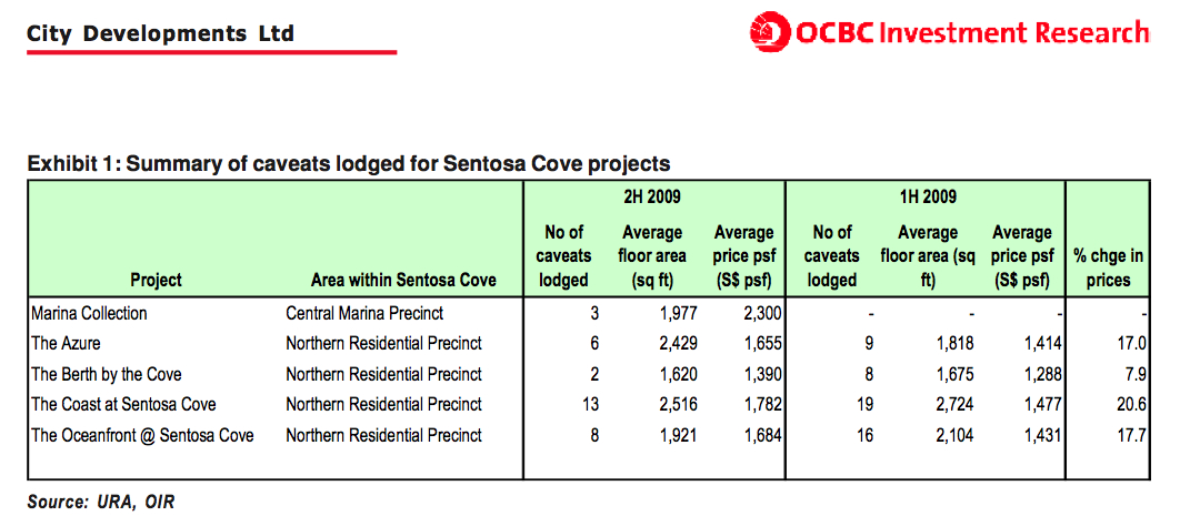 Recent months have seen a return of buying interests to Sentosa Cove. Last week, SC Global announced that its residential project, Seven Palms Sentosa Cove sold 6 out of the 10 released units at an average selling price of S$3,300 psf. In the sub-sale and resale markets, prices of other condominium projects on Sentosa have also recovered firmly in 2H09. We think that the time is ripe for City Developments (CDL) to launch its Quayside Isle Collection project soon. While we previously assumed a bear-case scenario pricing of S$1,400 psf for the project, we are now raising our selling price estimate to S$1,900 psf. As such, our projected profit contribution from the residential component of the Quayside Isle Collection project has now been raised from S$209.7m to S$386.2m. Our fair value of CDL has now been raised to S$9.83. We maintain our HOLD rating on CDL.