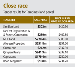 Sim Lian Land and Sim Lian Development jointly handed in the third highest bid of S$268 million, while the lowest bid was S$175.80 million from Leng Hoe Development.