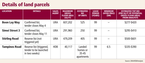 Chua Chor Hoon, head of DTZ’s South-east Asia research team said that both sites on the confirmed list were attractive. She estimates that the site on Boon Lay Way could go for $330-$390 per square foot (psf) of potential gross floor area, with homes there eventually selling for $720-$780 psf.