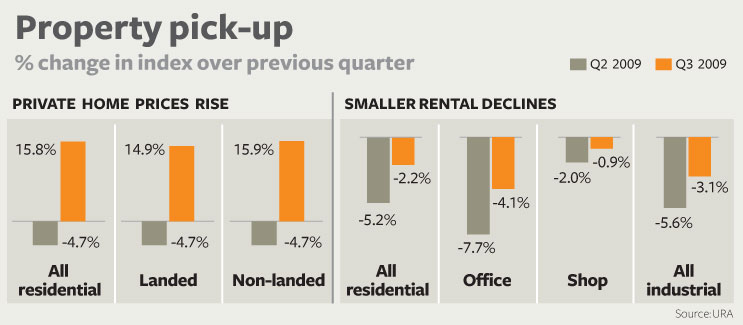 In tandem with a more cheerful economic climate, positive demand returned to the office market, after three consecutive quarters of negative take-up from Q4 last year to Q2 2009. Supply pipelines are shrinking – although there’s still ample supply of offices, shops and industrial space. Vacancy rates increased in Q3 for private homes, offices, factory space but decreased for shops and warehouses. URA’s numbers show that the overall private home price index increased by 15.8 per cent in Q3 over Q2, a tad shy of the 15.9 per cent jump reflected in its earlier flash estimate for the same period. The latest rise in the index reversed four preceding quarters of declines.