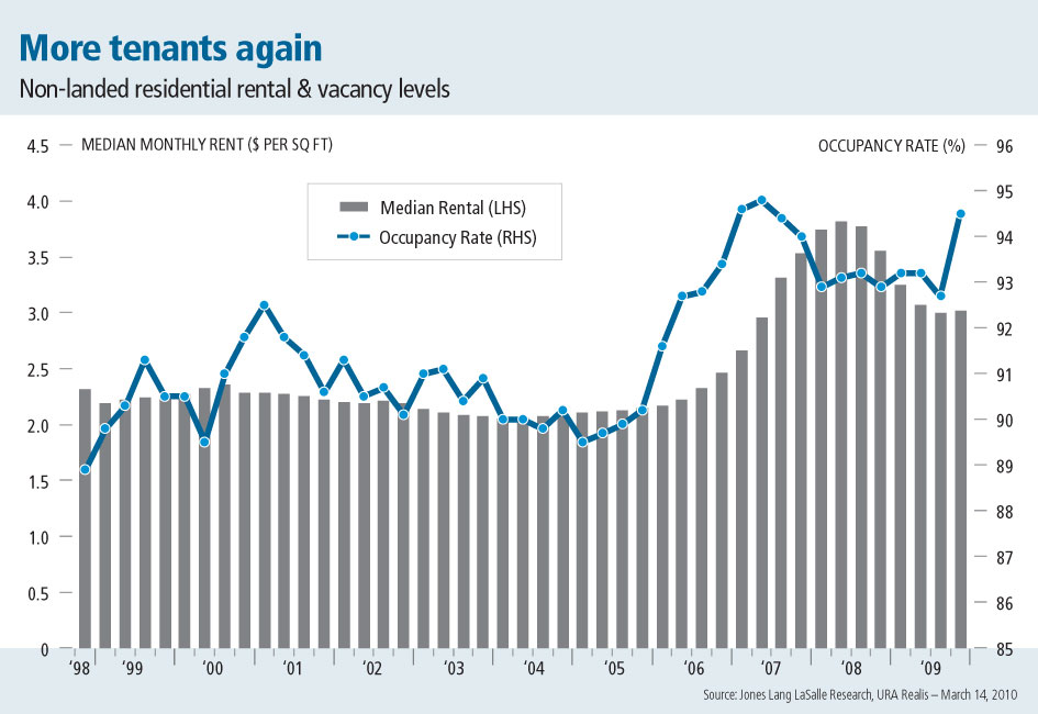 THE leasing market for non-landed homes showed signs of recovery in the final quarter of 2009, going by Urban Redevelopment Authority numbers. Median rents saw their first quarter-on-quarter growth of 0.5 per cent following five quarters of continued decline from a peak in Q2 2008. The monthly median rent in Q4 2009 was $3.02 per sq ft. Occupancy rates also jumped, achieving 94.5 per cent in Q4 2009 – a level previously seen only in 2006/2007.