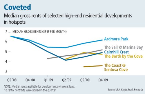 The Sail @ Marina Bay was the first high-end residential project in the area to come on the market. Completed in the second half of 2008, the 1,111-unit Sail saw median monthly rents climb steadily, from $4.25 per sq ft in Q1 2009, to $5.15 psf in Q4 2009, going by figures from the Urban Redevelopment Authority (URA).